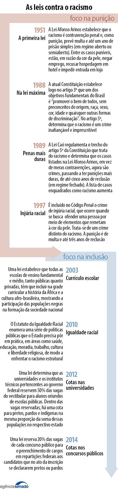 Foi só com a redemocratização e a atual Constituição, na década de 1980, que o ativismo negro mais uma vez renasceu e o racismo enfim passou a ser encarado com rigor. O foco mudou da punição dos atos racistas para a inclusão social da população negra. Entre as novas leis, estão a das cotas raciais nos vestibulares, de 2012, e a das cotas nos concursos públicos, de 2014.