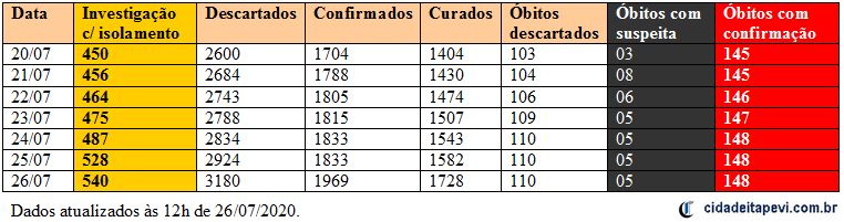 Na segunda-feira que se passou (20), Itapevi contava com 450 casos em investigação com isolamento domiciliar, 1704 confirmados pela doença e 145 óbitos pelo novo coronavírus.