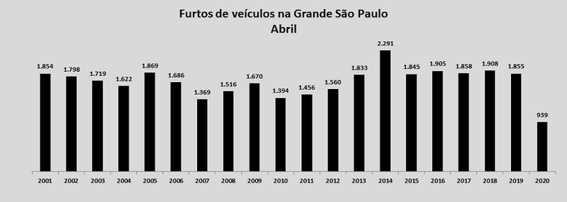 Os furtos em geral e de veículo apresentaram as menores quantidades da série histórica iniciada em 2001. O primeiro indicador recuou 49,9%, passando de 6.087 para 3.051 ocorrência, se comparado abril de 2019 e 2020. A segunda modalidade criminosa caiu 49,4%, com uma diferença de 916 casos (de 1.855 para 939). É a primeira vez na série histórica, iniciada em 2001, que o total fica abaixo de mil.
